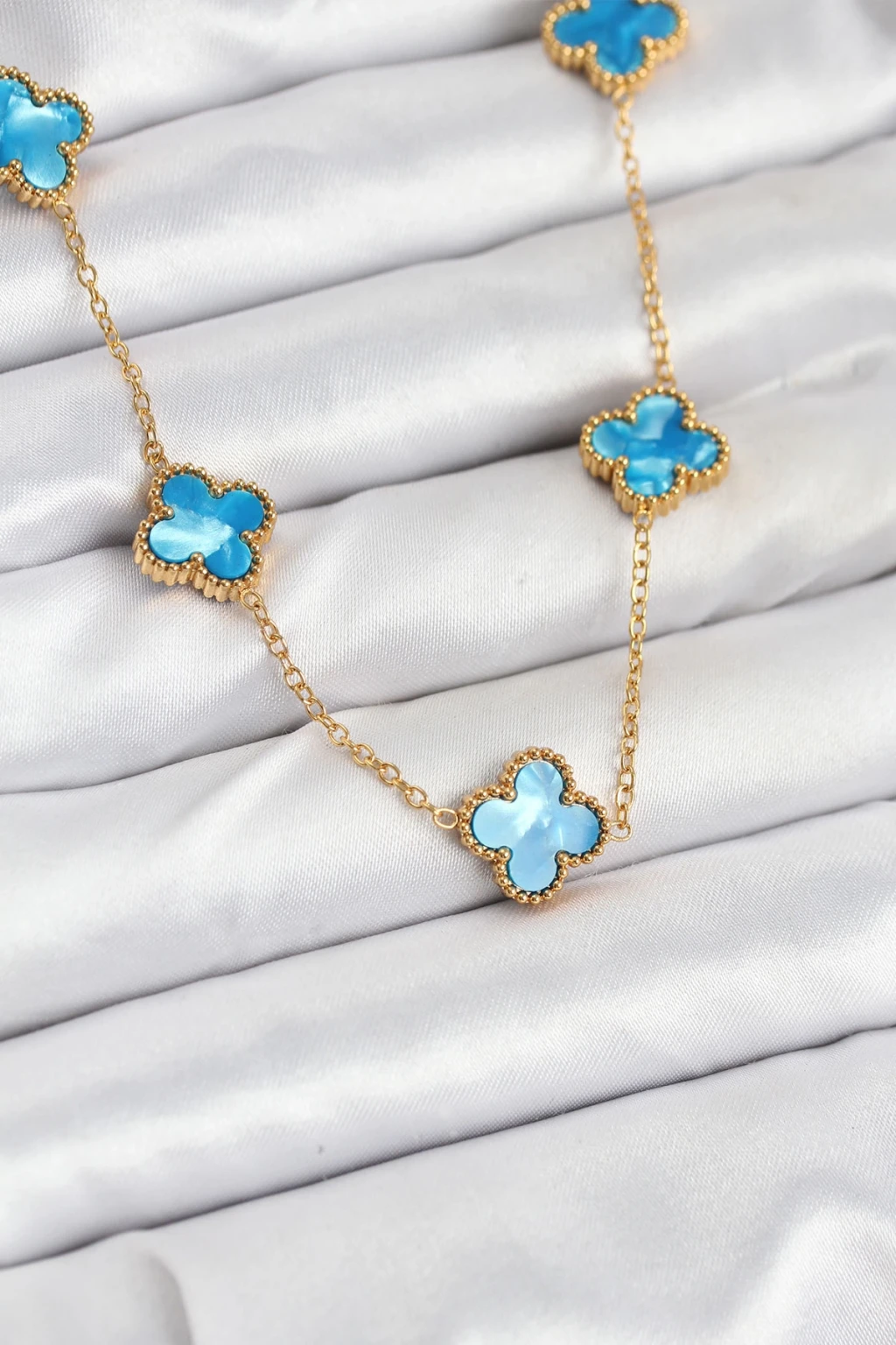 316L Çelik Zincir Gold Buz Mavisi Renk Yonca Kolye