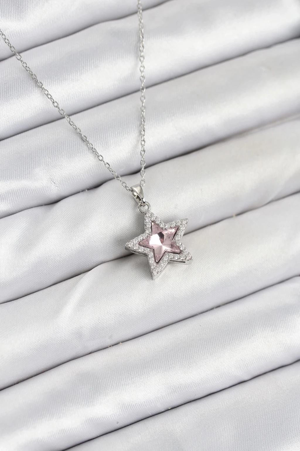 316L Çelik Zincir Gümüş Renk Pembe Taşlı Yıldız Model Kadın Kolye
