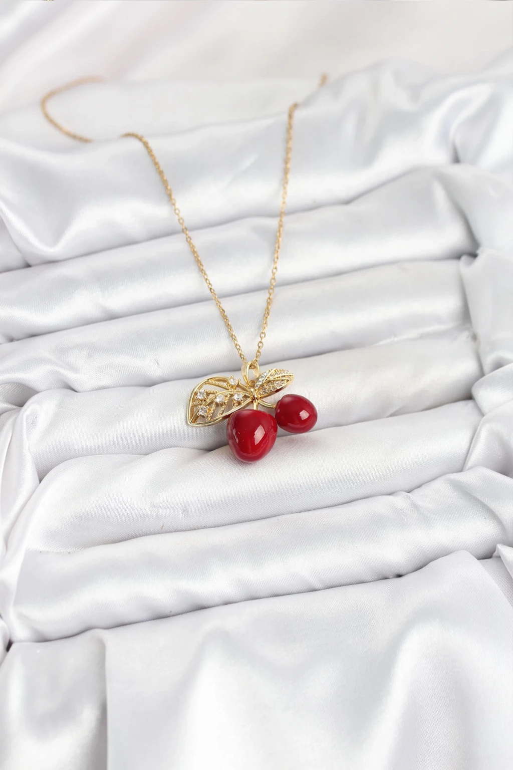 316L Çelik Zincir Yapraklı Kiraz Model Gold Renk Kadın Kolye