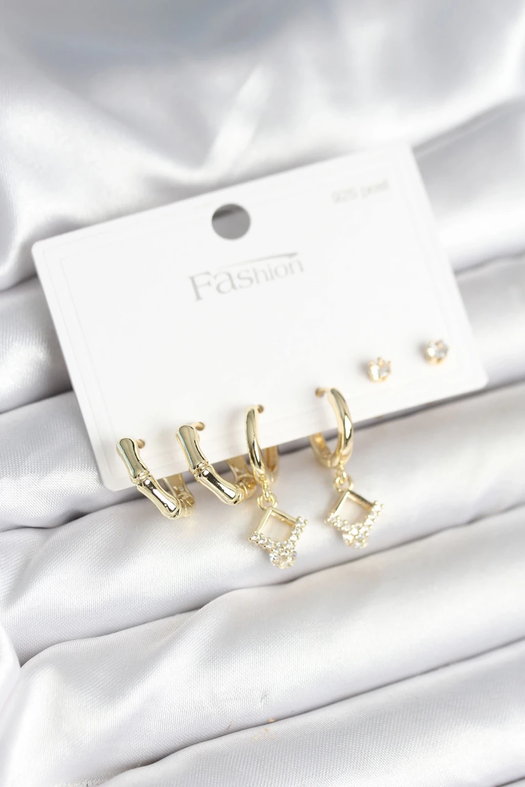 Pirinç Gold Renk 925 Ayar Gümüş Çivili Kadın Küpe Seti