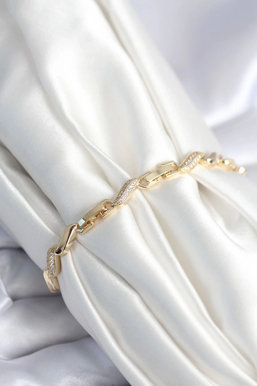 Pirinç Gold Renk Zirkon Taşlı Sarmal Model Kadın Bileklik
