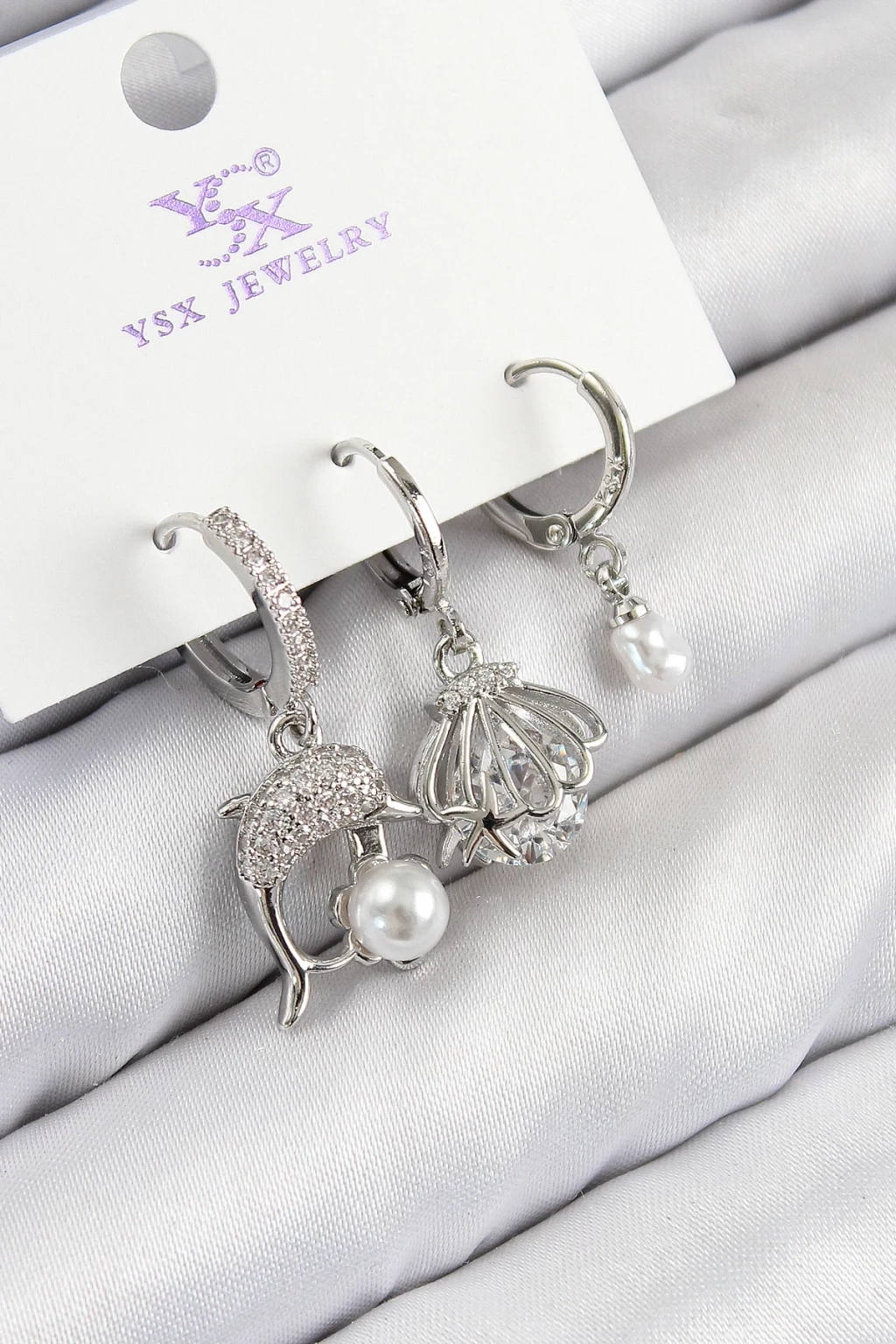 Pirinç Zirkon Taşlı 3'lü Yunus Balığı Ve İstiridye Model Gümüş Renk Kadın Küpe