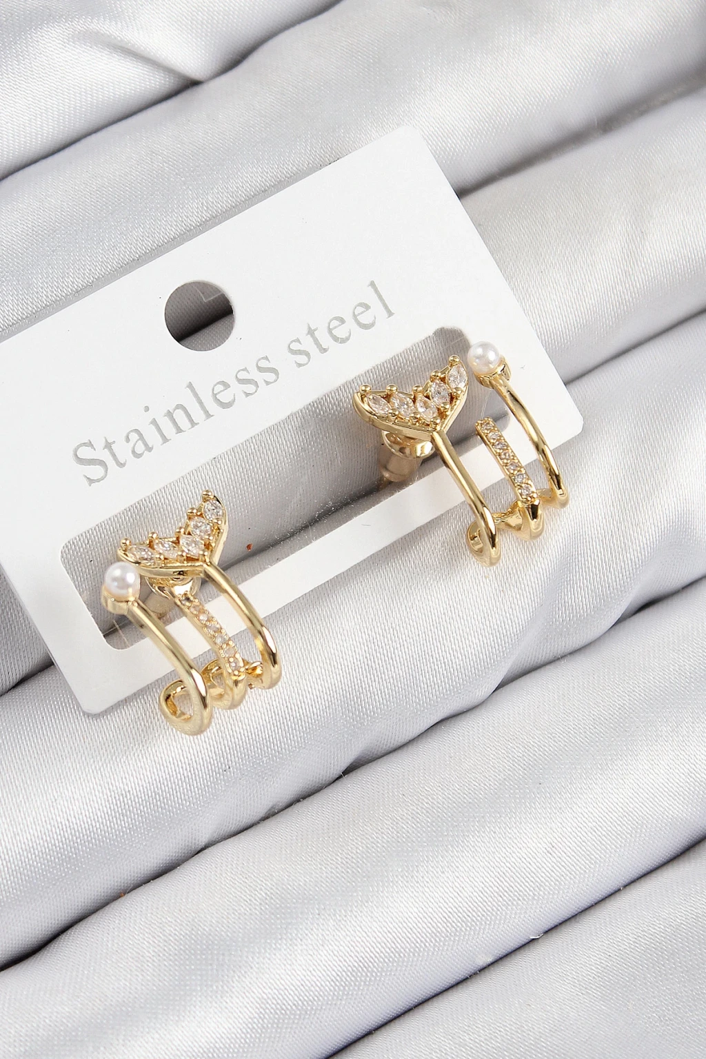 Pirinç Zirkon Taşlı İnci Detaylı Balık Kuyruğu Model Gold Renk Kadın Küpe